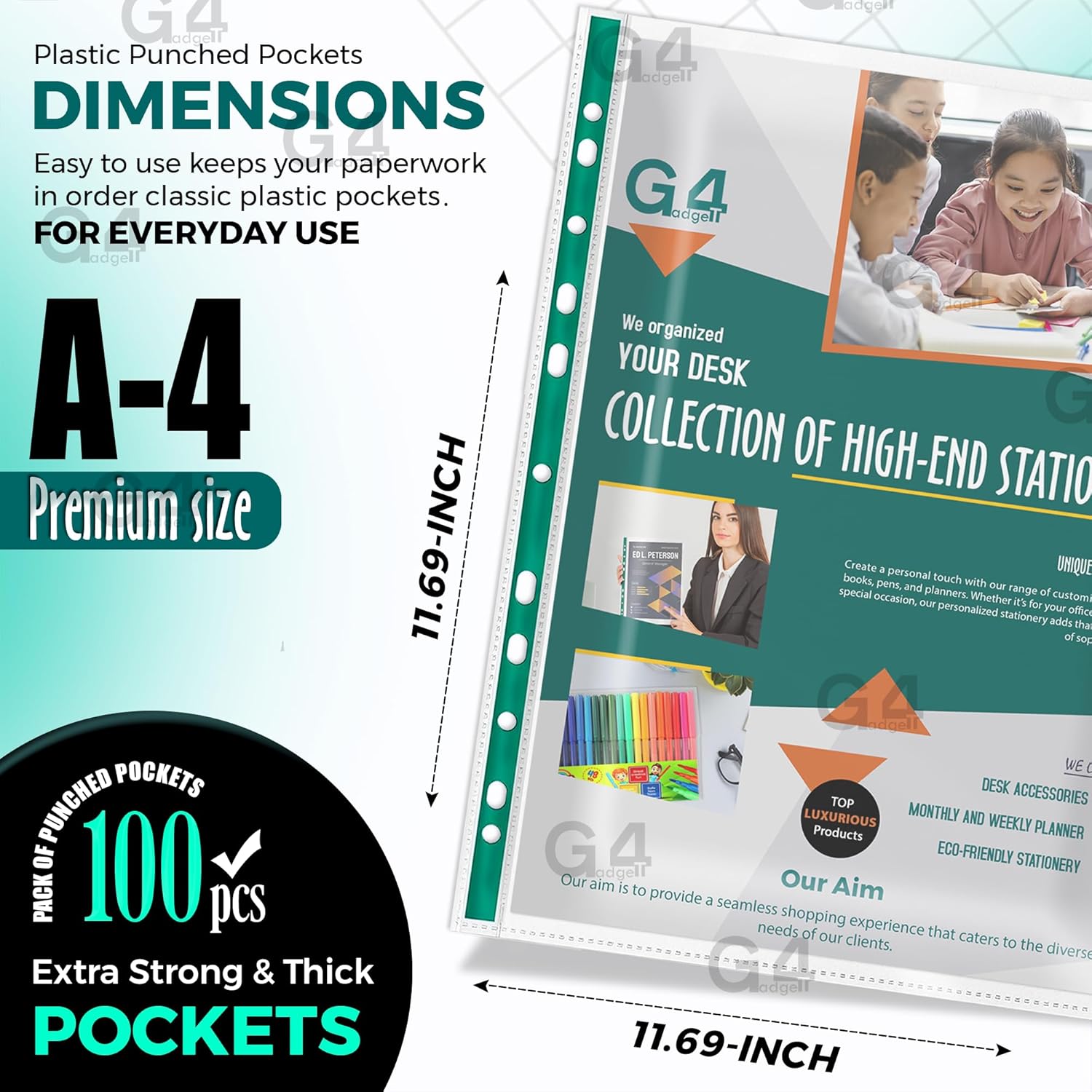 100 A4 Clear Plastic Punched Pockets – 30 Micron Sheet Protectors for Files & Folders
