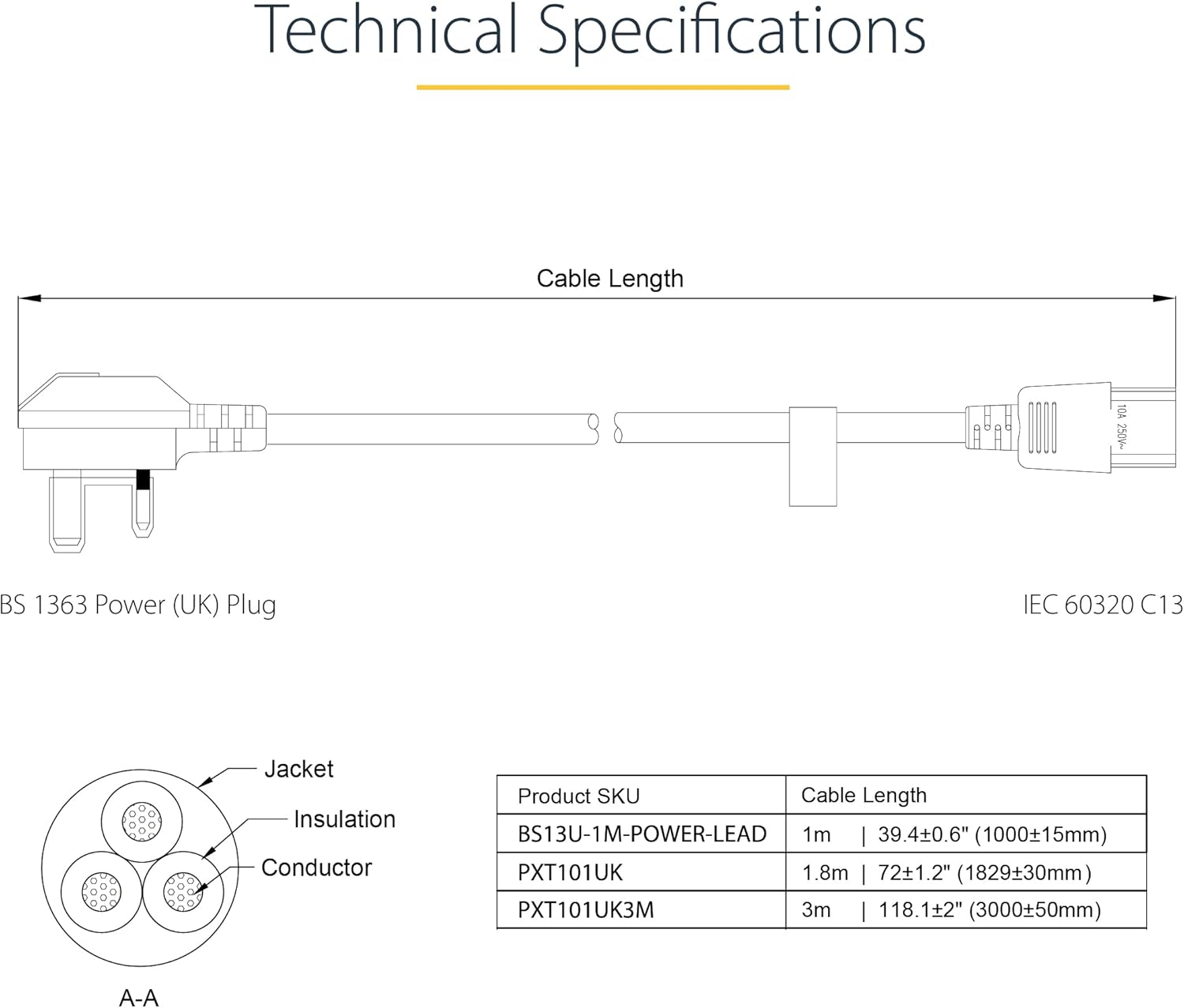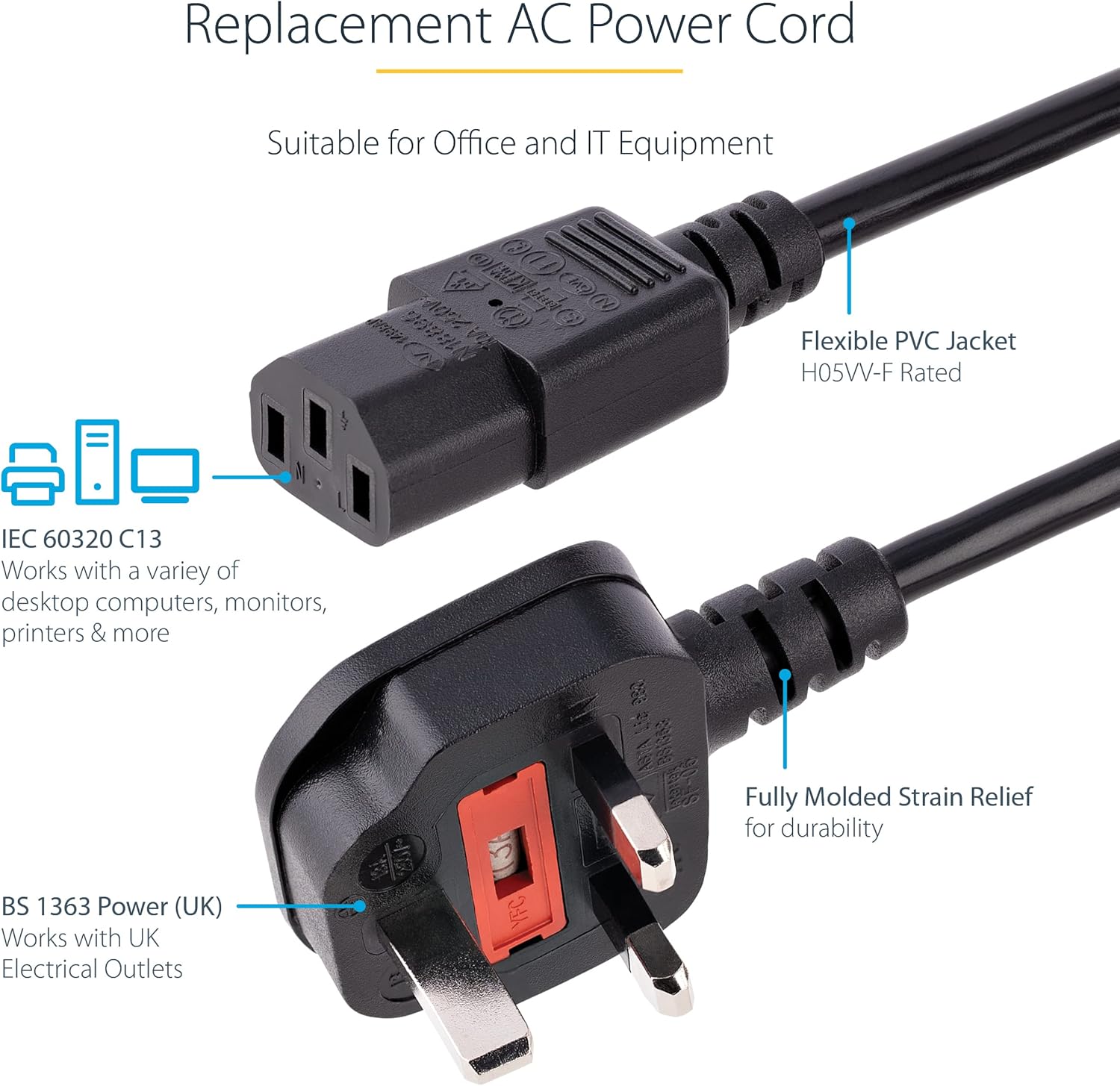 "10ft UK Power Cable BS1363 to C13 – 13A Kettle Lead for PC, Monitor, TV – Black