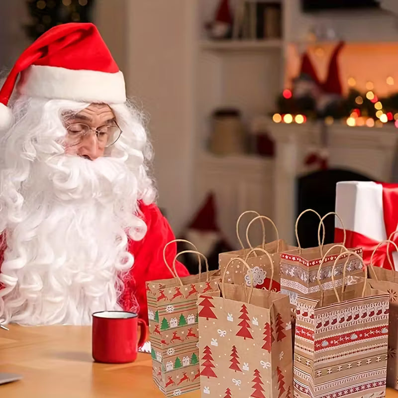 12pcs Festive Kraft Paper Gift Bags with Handles, Assorted Cartoon Christmas Designs for Holiday Party Favors and Presents
