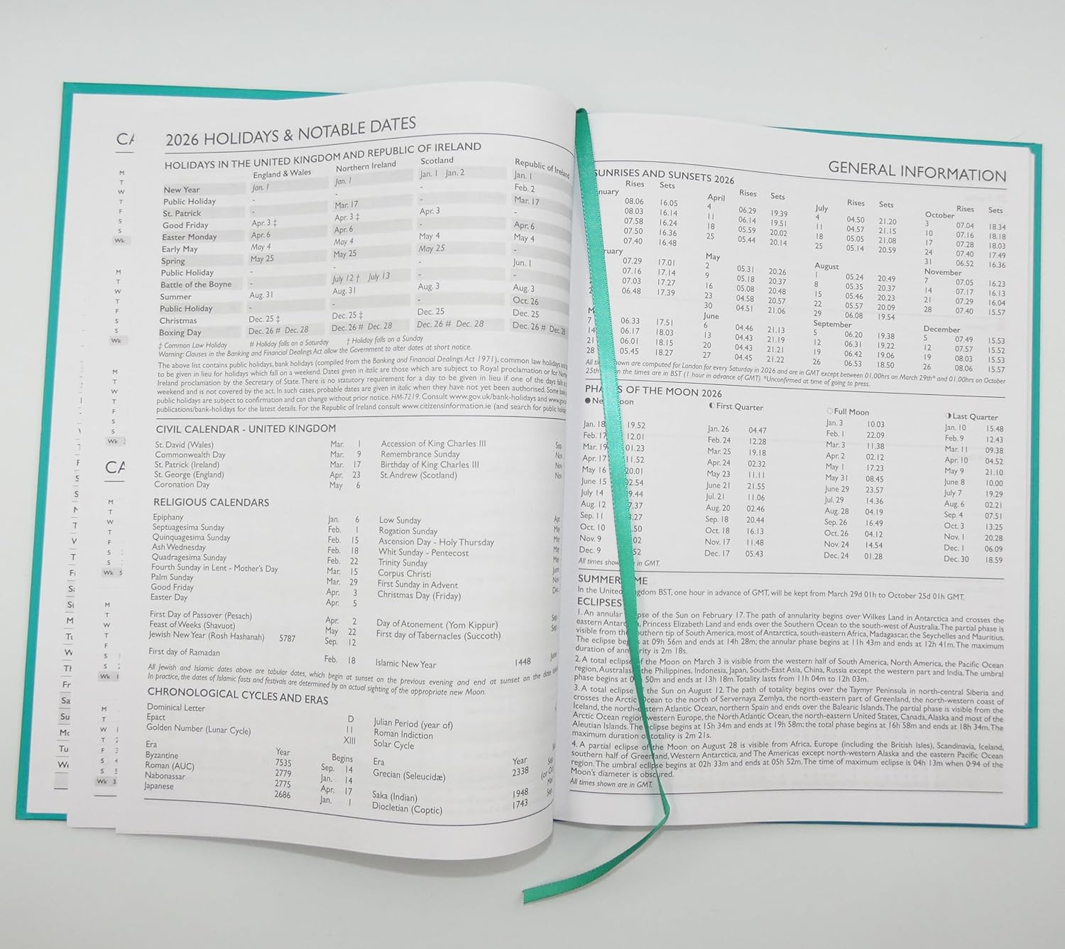 Informative Reference Pages – Provides metric conversions, clothing size guides, international information, public holidays, key UK dates, and sunrise/moon phase details.
