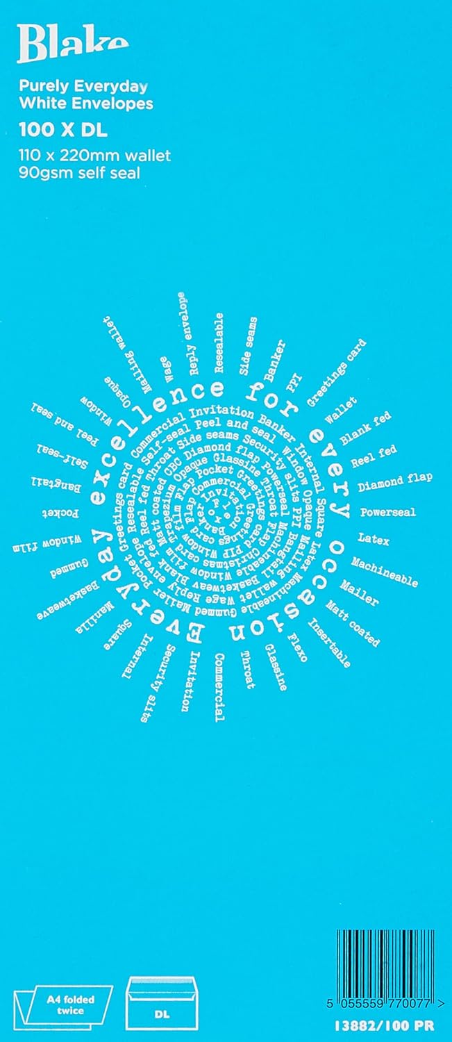 Blake Purely Everyday Self-Seal Wallet Envelopes, DL Size (110 x 220 mm), 90 gsm, White – Pack of 100