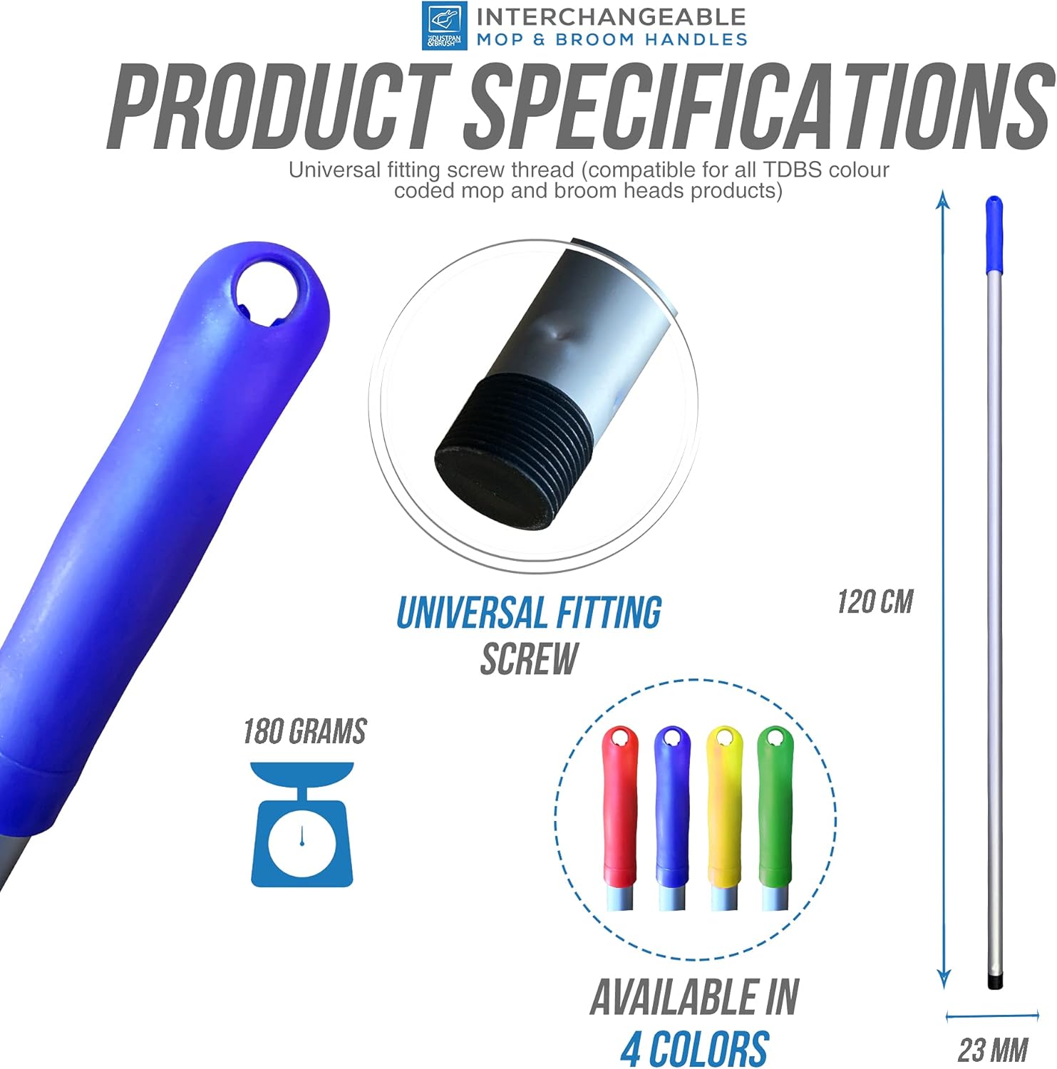 - Universal Fitting Long Broom Handle and Mopping Stick – If you are looking for a floor mop handle replacement that can fit most of the indoor & outdoor broom heads and mop heads, this is the right product for you. These 23mm diameter screw thread handles for floor mop are interchangeable and compatible with all colour coded mop heads and broom heads by The Dustpan and Brush Store.