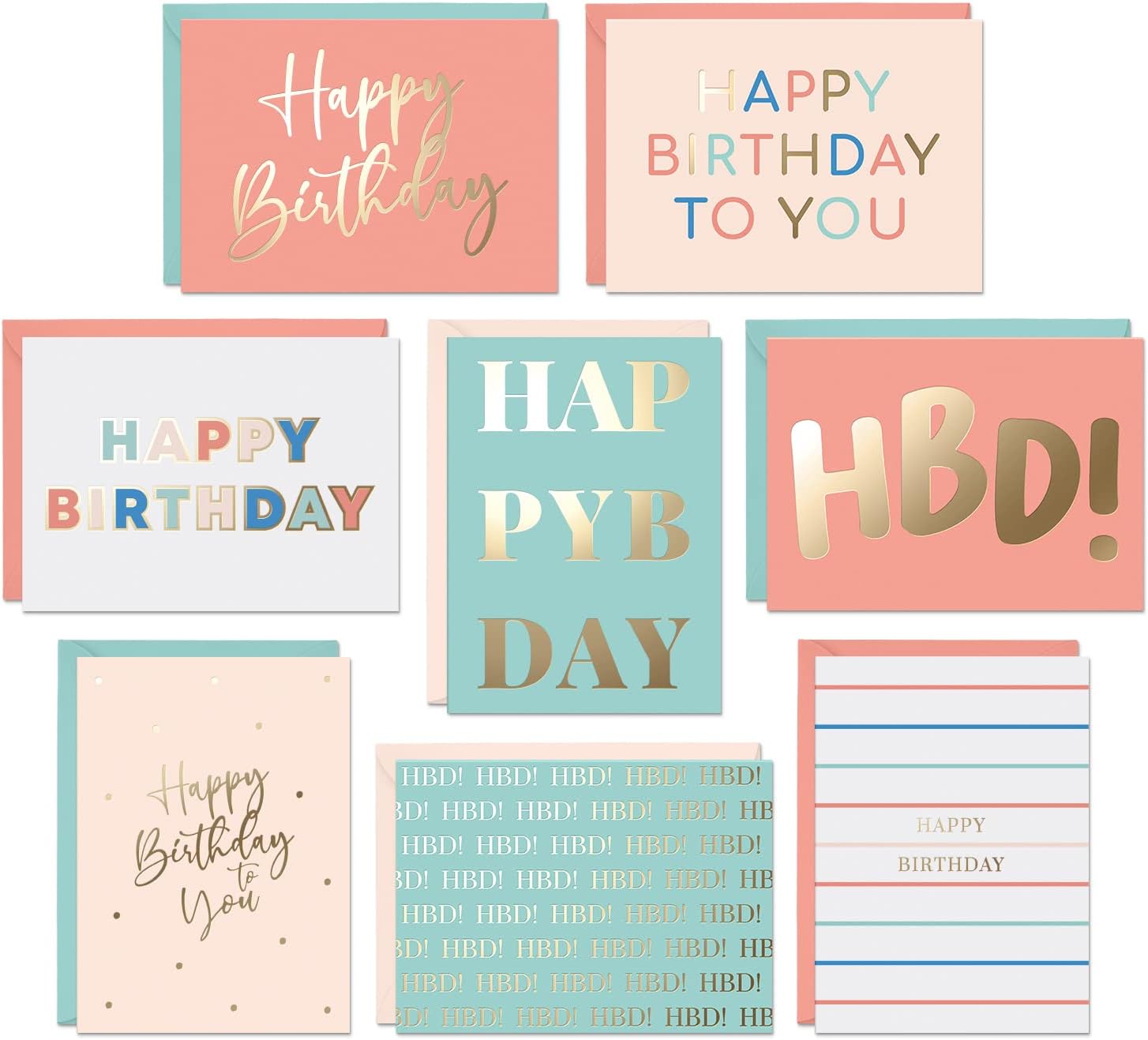 - BEAUTIFUL GOLD FOIL DESIGN: These are the sturdiest birthday cards on Amazon. They may also be the most stylish. This set contains 24 cards in 8 unisex birthday typeface designs. Perfect for boys, girls, grown up friends, and workmates! With a set of bulk birthday cards with envelopes, there are no excuses to forget anyone!