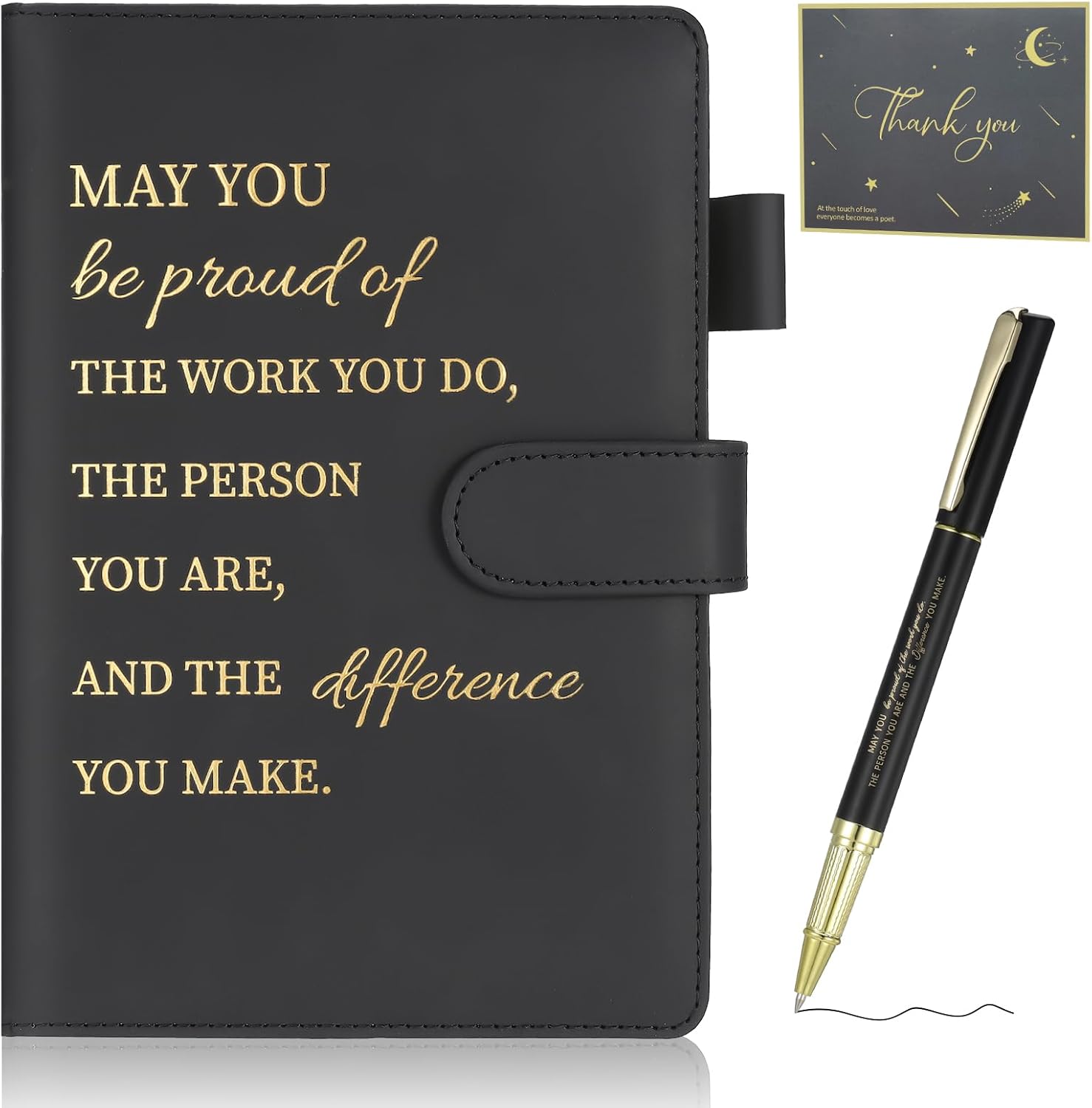 - 【Motivation and Appreciation】The notebook cover and pencil are printed with gold motivational text, ‘May you be proud of the work you do, the person you are, and the difference you make.’ The thank you card says ‘Thank you’. Expressing gratitude and recognition to the recipient conveys respect and appreciation.
